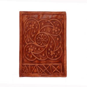 Cahla prevazuta cu rame laterale, dreptunghiulara, nesmaltuita, decor in relief cu motive ornamentale astrale, antropomorfe, fitomorfe si geometrice. Secolul al XVI-XVII – lea, Corund.
