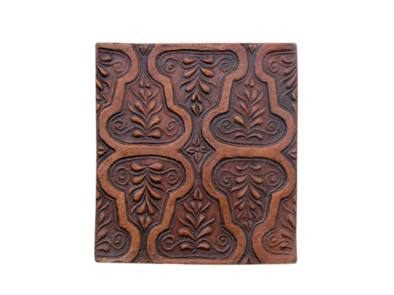 Cahla nesmaltuita, decor in relief cu motiv decorativ tip brocat si elemente ornamentale florale. Secolul al XVIII-lea, Targu Secuiesc.