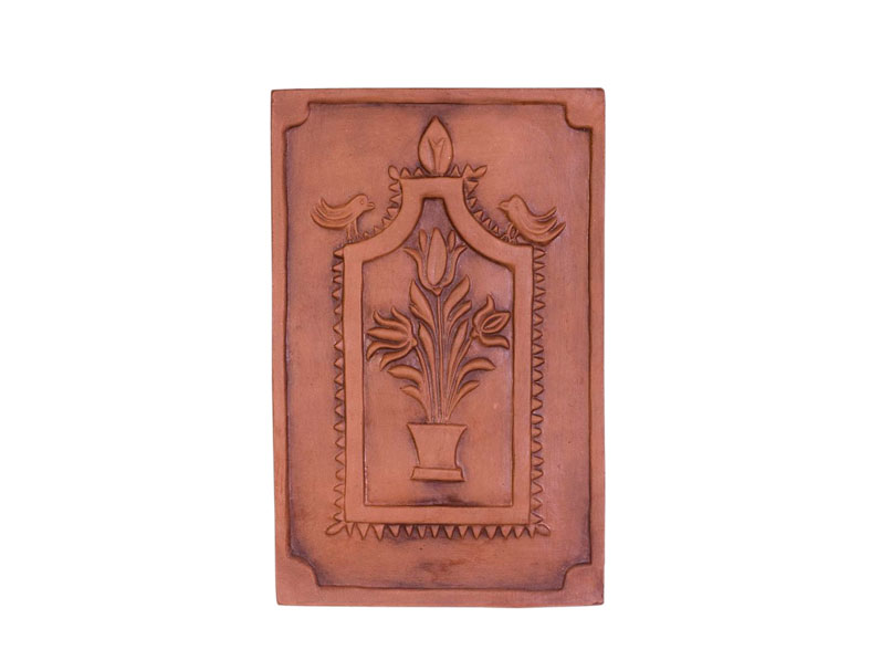 Cahla de teracota nesmaltuita, de format mare, decorata cu ornament floral. In cele doua colturi sunt amplasate figurine stilizate de pasari. Secolul al XVIII-lea, Targu Secuiesc.