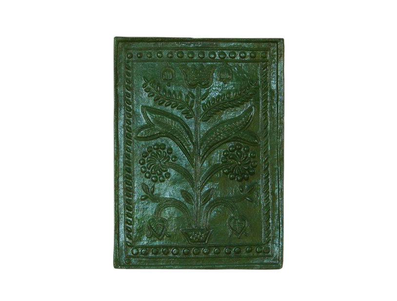Cahla smaltuita in verde, dreptunghiulara, prevazuta cu rame laterale multiple, decor in relief cu motive ornamentale florale. Secolul al XIX-lea, Targu Secuiesc.