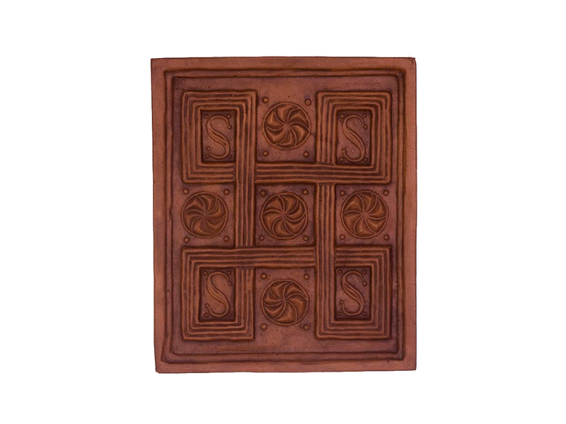 Cahla de soba dreptunghiulara, nesmaltuita, cu rame laterale. Decor in relief cu motive ornamentale geometrice, rosete si motive asemanatoare literei S. Secolul al XV-XVI-lea, Cristuru Secuiesc.