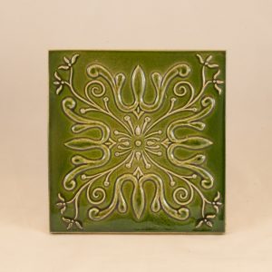 Barnásvörös, mázatlan, töredék alapján rekonstruált, borda nélküli kályhacsempe. Teknőszerűen mélyülő előlapját központi dudorból kiinduló kecses, szimmetrikusan elhelyezett virágminta díszíti, rézsűs oldalain S betűkből alkotott hullámvonal fut körbe. 17. század, Pálfalva, Csíkszentkirály.