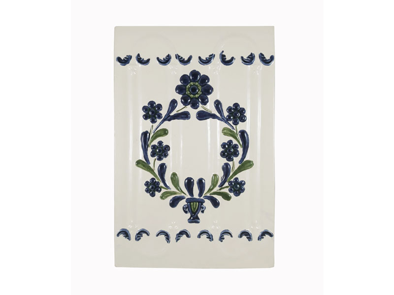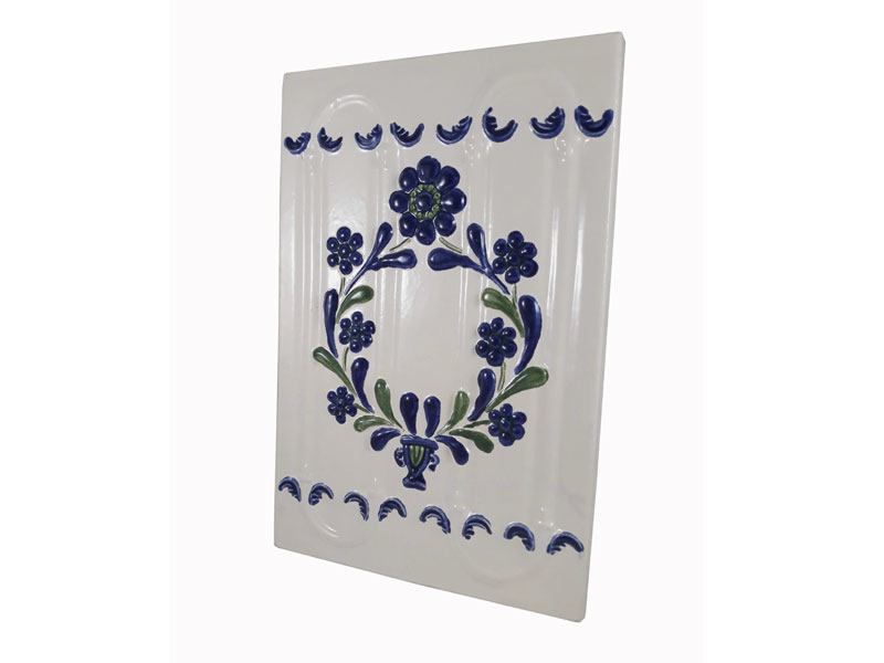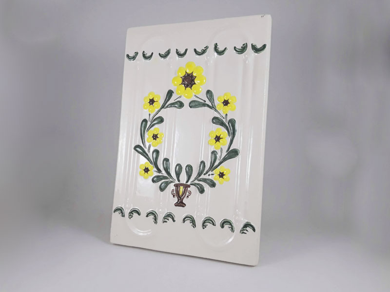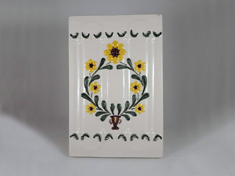 Cahla cu rame laterale, dreptunghiulara, angobata, smaltuita, inscriptionata, decor in relief si canelat, cu motive ornamentale arhitecturale, skeomorfe, florale, fitomorfe.. Decorul piesei este pictat policrom, cu cornul. Pe spatiul decorativ s-au modelat prin presare manuala patru caneluri verticale. Terminatiile canelurilor au fost unite printr-un arc de cerc reliefat, decorat marginal cu cate doua frunze. Cele doua spatii inferioare si superioare ale cahlei sunt decorate cu un motiv fitomorf. In centrul piesei este amplasat un vas din care porneste o cununa formata din doi lujeri cu frunze si sapte flori cu petale.