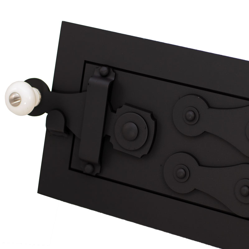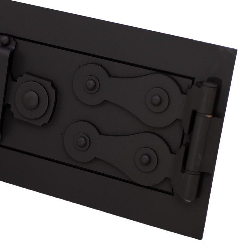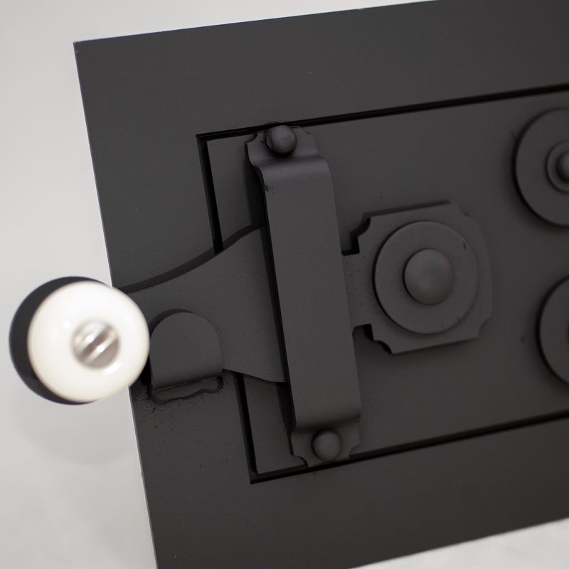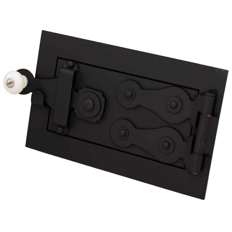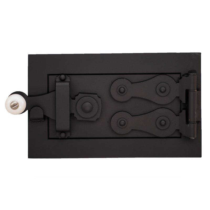 Usa de cenusar realizata in stil rustic, design simplu care se potriveste la sobele de gatit, prevazute cu plita, dar la fel si la bucatariile de vara, exterioare, prevazute cu soba de gatit. Usa este realizata din profile metalice de calitate superioara, prevazuta cu maner din ceramica glazurata in alb.